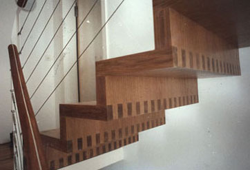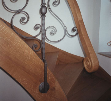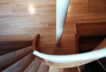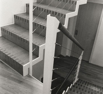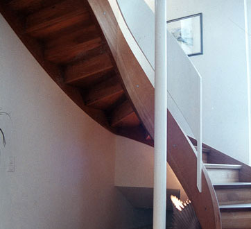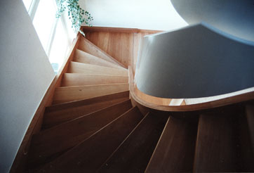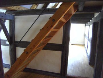 Die Treppe verbindet Keller und Galerie im offenen Treppenhaus.
